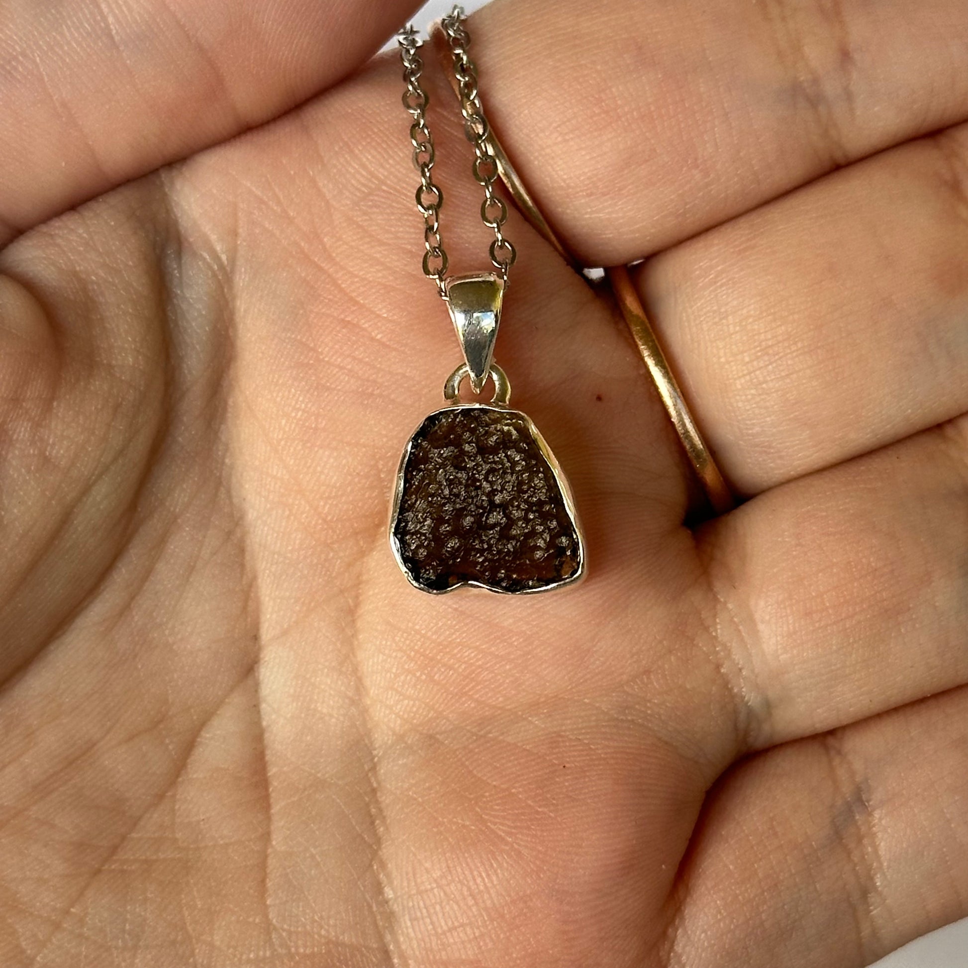 This is a genuine sterling silver Moldavite pendant created in the Czech Republic. Please note the chain is not sterling silver. This piece comes with a certificate of authenticity.